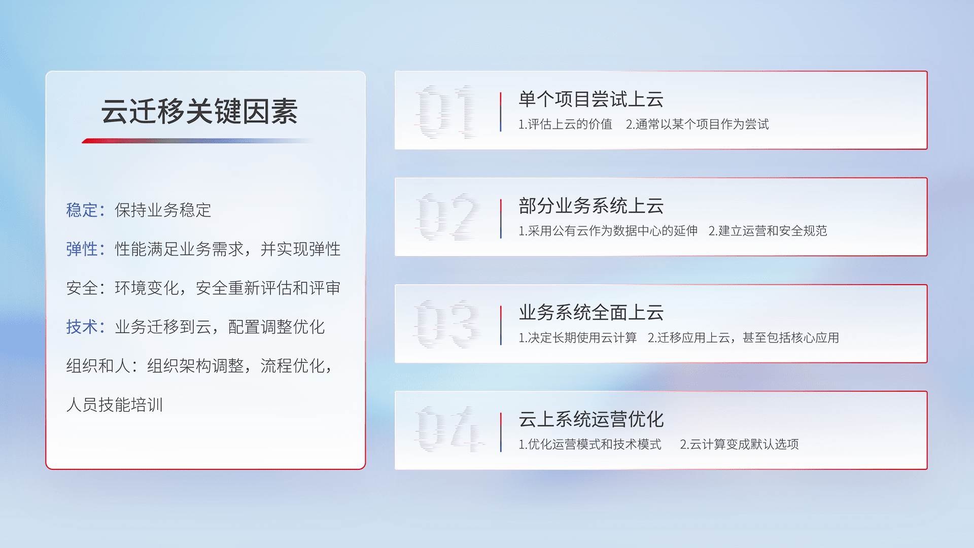 结合实际业务,,从规划设计、、云平台选型、、、、云原生改造、、、数据迁移、、集成交付,,,迁移全过程为客户识别最佳上云路径,,做好风险识别管理,,,,设计网络架构、、、身份权限、、安全审计合规、、操作审计、、、、日志审计、、、、监控告警策略、、、多站点容灾设计等,,对云上基础设施进行整体规划,,,提升IT治理水平,,以满足弹性、、、、高可用、、、、高性能的需求。。。。