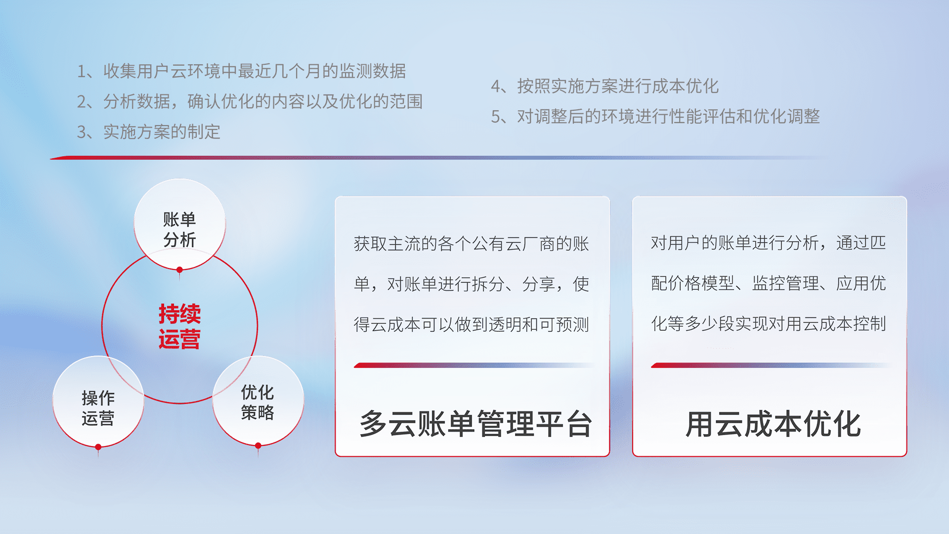 通过多云纳管,,,,以统一的资源数据模型把客户的云资源进行抽象和封装,,进而实现对多云资源的统一操作,,保障云资源管理的可靠性、、稳定性与可用性。。。。量身定制化运维内容,,,,配置、、、、开发运维、、补丁管理、、备份、、、、监控、、、、认证和访问管理、、、审计和日常巡检等,,保障在用云过程中的可靠度,,,,稳定度以及高可用率。。。。